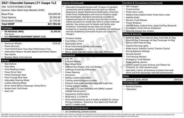 Satin Steel Metallic 2021 Chevrolet Camaro LT1 2D Coupe RWD 6.2L V8 6-Speed Manual